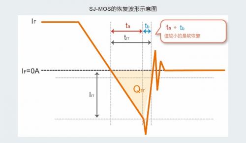 通常,二极管存在反向恢复时间(trr)短但容易产生噪声的硬恢复和不容易产生噪声但反向恢复时间(trr)长的软恢复两种恢复模式。超级结 MOSFET的内置二极管的特点是硬恢复特性尤为显著。表示软恢复性能的指数采用图中的ta÷tb。