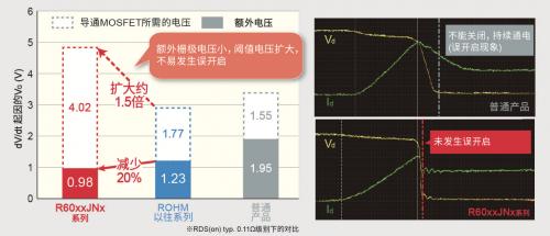 本系列产品通过优化MOSFET结构上存在的寄生电容,将开关时的额外栅极电压降低了20%。另外,使MOSFET导通所需的阈值电压(Vth)增加了约1.5倍,是“不易产生误开启现象的设计”。因此,扩大了用户通过栅极电阻来进行损耗调节的范围。