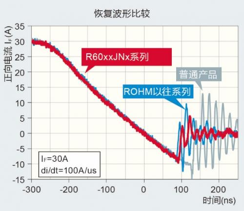 通常,超级结MOSFET的内置二极管的恢复特性为硬恢复。但是,ROHM的R60xxJNx系列,通过优化结构,与以往产品相比,新产品的软恢复指数改善了30%,不仅保持了极快的反向恢复时间(trr),还成功减少了噪声干扰。因此,用户通过栅极电阻调节噪音干扰时变得更加容易。