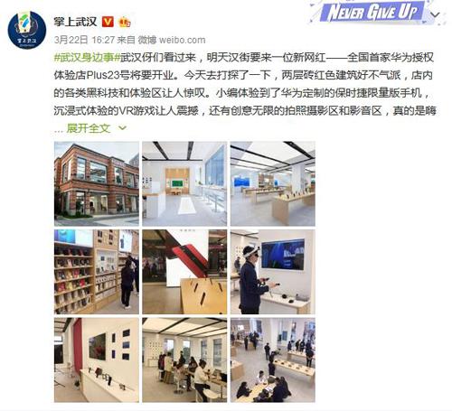 3月23日,全国首家华为授权体验店Plus在武汉楚河汉街正式开业了,一经开业便吸引了很多人前来打卡体验,俨然一副汉街新晋网红的样子。其实在开业之前,从2月28号试营业时便已吸引不少武汉本地的微博博主前来探店体验,不少博主还在微博纷纷晒图发表自己的体验感受。