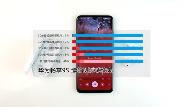 100%电量开始测试,使用华为畅享 9S观影30分钟,掉电1%;使用华为畅享 9S播放音乐30分钟,掉电1%;接着使用华为畅享 9S上网30分钟,掉电2%;最后再使用华为畅享 9S玩30分钟游戏,掉电9%。两个小时,华为畅享 9S总共掉电13%,续航表现非常优异。以此推算,华为畅享 9S使用一整天丝毫不是问题。