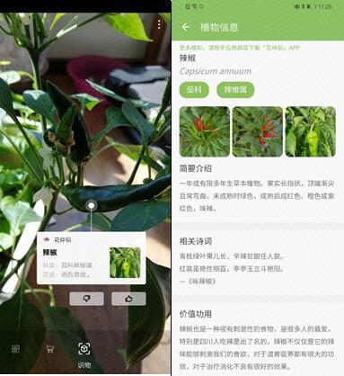 “识物”,对着不认识的植物拍,能自动识别出来,显示植物的名字和信息,相当于随时带着一部百科全书……
