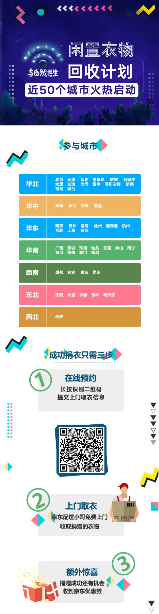 从现在起,北京、上海、天津、南京、郑州、宿迁、广州、深圳、成都、昆明、重庆等近50个城市的用户,只要一键呼叫京东快递小哥,就会有人上门免费回收闲置衣服。这些回收的闲置衣服会通过捐赠、环保处理、公益捐助的方式帮助到有需要的人,整个操作流程完全公开透明!