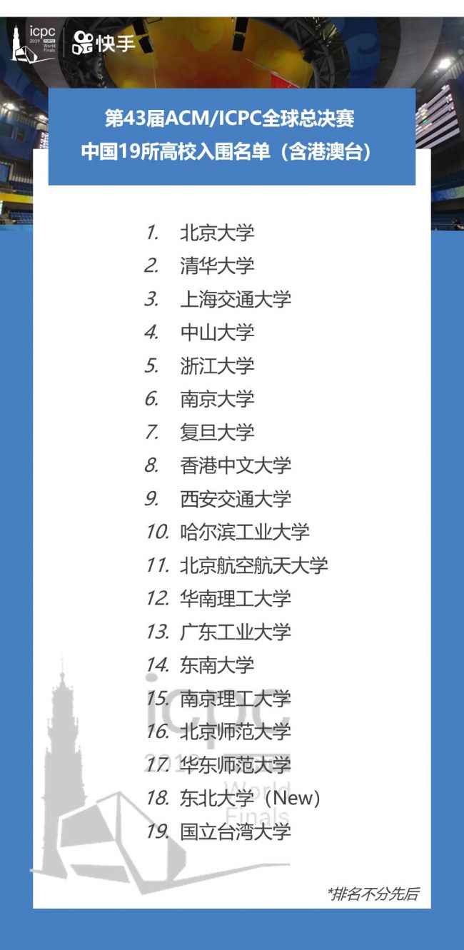 ACM 国际大学生程序设计竞赛是由国际计算机协会(ACM)举办的一项面向全球大学生开放的编程比赛,至今已有近 40 年的历史,是世界范围内历史最悠久、规模最大的程序设计竞赛,被誉为“大学生编程奥林匹克竞赛”。比赛主要考察大学生创新能力、团队精神和在压力下编写程序、分析和解决问题能力。本届决赛中有19所中国高校入围。