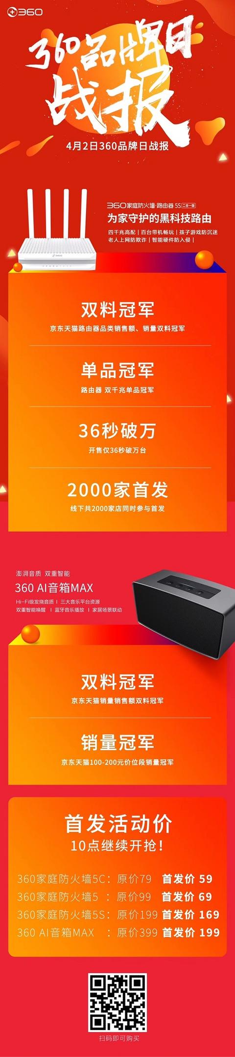 目前,360两款新品爆款仍在火热发售中,更有首发活动价惊喜来袭!京东、天猫、360会员商城抢购360家庭防火墙,59元起步即可购得;360AI音箱MAX则在京东、天猫、360会员商城、苏宁、拼多多五大平台同步开售,原价399元,尝新价只需199元!