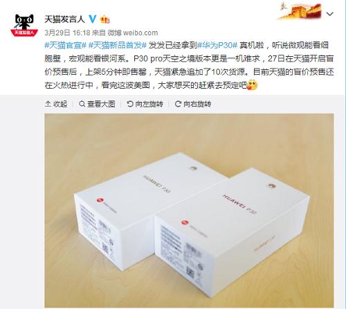 根据天猫发言人官方微博数据显示,华为P30的预售情况非常火爆,其中P30 Pro天空之境版本更是一机难求,3月27日在天猫开启盲价预售后,上架5分钟即售罄,天猫紧急追加了10次货源。预售火热程度可见一斑。