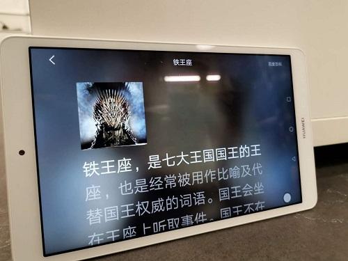 冰与火的战争引人期待,但无论从制作方宣传,还是剧迷的热议话题中都可以看出,谁将坐上铁王座这个终极悬念,可能要到最后才能揭晓。所以新剧迷观影第一课,就是了解铁王座的重要性。而此时,在8英寸华为平板M5青春版的智能语音模式下,语音唤醒“小艺小艺”,说出“铁王座”,相关信息马上就能显示,而且还能语音播放,不必盯着文字看。5米之内,8英寸华为平板M5青春版都能对你的指令做出及时反应,让你解放双手的同时,轻松追剧。