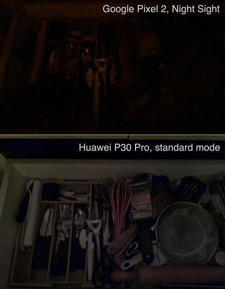 上图为外媒Pocket-lint拿谷歌Pixel 2和华为P30 Pro在暗光环境下的拍摄对比,在一个近乎漆黑的厨房里,拍摄了一些邋遢的厨房用品。当时就连拍摄者的肉眼都看不清这些东西,但华为P30 Pro却拍的十分清晰,就像打开了一盏很暗的台灯。这就得益于超感光传感器的辅助,令人印象难忘。