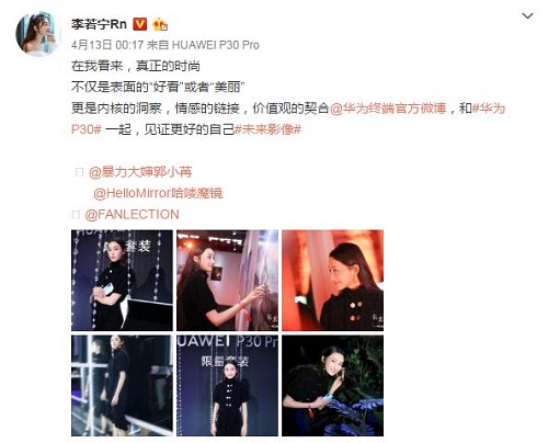 比如:@景甜和@娜扎,这两位女明星不仅长得美,而且衣品和时尚感也是娱乐圈首屈一指的。另外@王铮亮也在第一时间换上了华为P30 Pro天空之境版本,甚至与华为P30 Pro同框自拍发微博,可见@王铮亮对华为P30 Pro喜爱之情。我们知道华为P30系列并无代言人,这些时尚明星纷纷换上华为P30系列很明显是自发行为,背后我们能够看得出这些明星对华为P30系列时尚和科技魅力的认可。