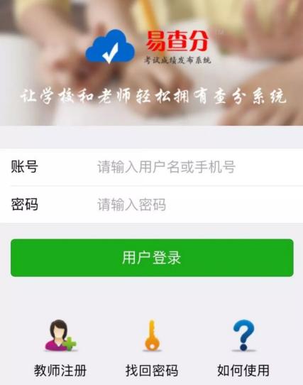 进入易查分网站后,首先点【教师注册】,注册一个新账号,以后老师就用这个账号登录,发布和管理成绩,学生不需要注册。