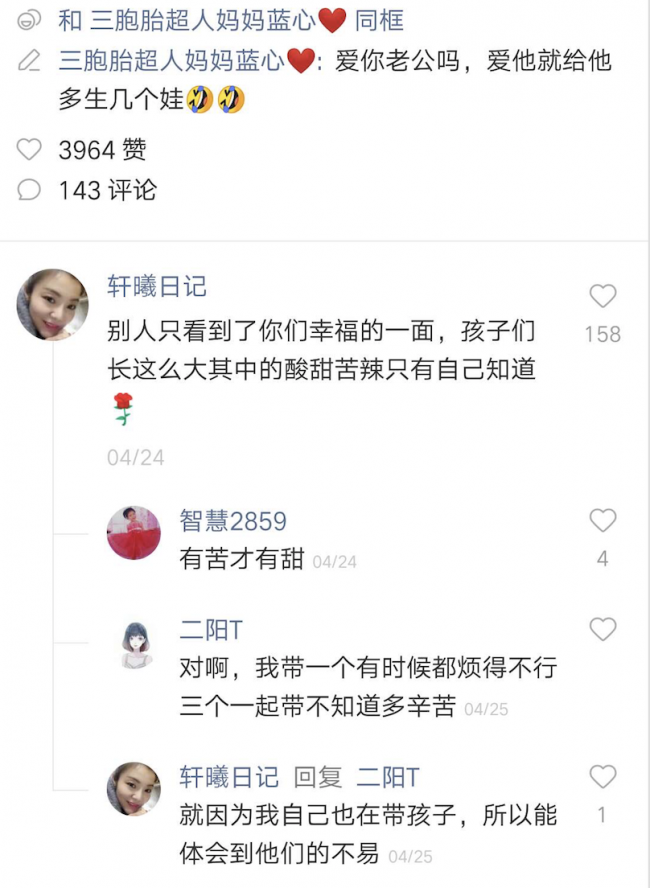 四胞胎除了“让人羡慕”这一点好处之外,全是无奈:买衣服四份,做饭四份,买玩具四份,甚至连两个手的拥抱,都要分成4份。90后的她感慨:养这么大,不容易啊。