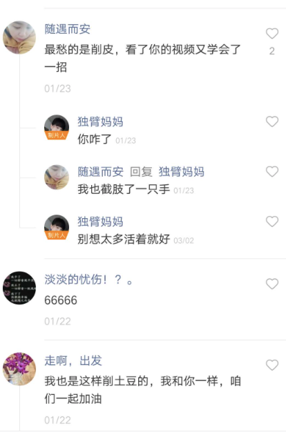 在她拍摄的作品里,不是在削土豆,丝瓜,藕,笋,就是在烙饼,切菜,杀鱼。所有这些家务活,无不需要用到手。上帝关闭了一扇门,于是她只好改用“窗”。独臂妈妈的解决方式是,无论洗衣做饭,还是打扫、农活,手脚并用:切菜时,用包着保鲜膜的脚按住菜,另一只手拿着刀切。需要削皮的蔬菜,她会把削皮工具夹在腿肚子处,顺利使用出另一只“手”的功效。独臂妈妈说,到什么时候有什么时候的方法,办法总比困难多。
