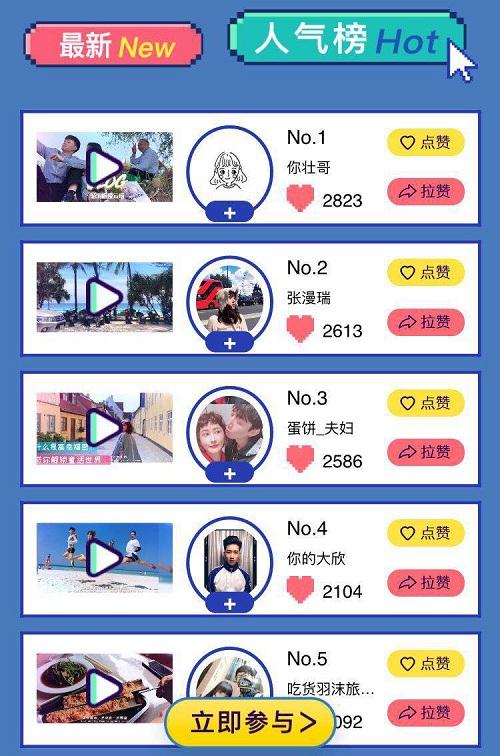 最后,再偷偷告诉大家一个参赛小秘诀。上传视频成功后一定要记得分享朋友圈,让朋友们为你的视频点赞打call!这样你的人气指数就会“唰唰唰”地往上升,官方大大不注意到你都困难呢。如果有你喜爱的达人,想为他加油打call,也可以在活动主页面的人气榜单中为他点赞和拉赞哦。
