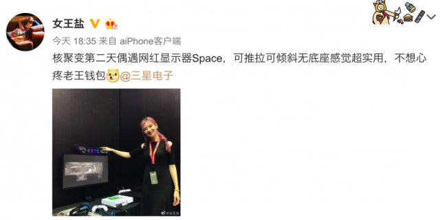 内个,事情是这样子的。当红游戏主播女王大人(女王盐)在核聚变现场Pick了一台三星“网红显示器”,并在微博表示“不想心疼老王钱包”,广大“机友们”又被猝不及防的喂了一把狗粮。这对人气情侣一直备受“机友们”关注,除了对主机游戏的专业见解之外,该CP的台前幕后同样为大家津津乐道。在刚刚过去的这个周末,又有不少网友在核聚变北京站偶遇了老王和女王盐。