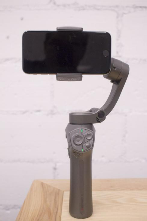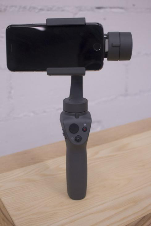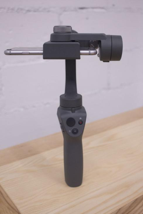 在手机未安装APP,且稳定器处于关机的状态下,将手机大约中部位置夹在稳定器上,呈现这种状态: