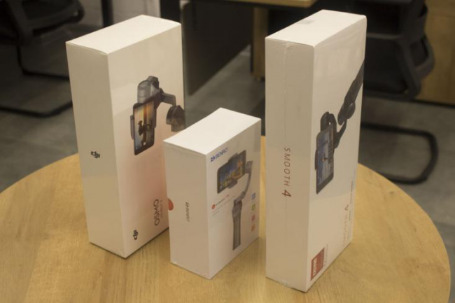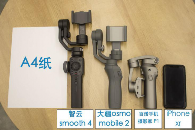外包装大小方面,智云smooth 4由于有送三脚架,包装盒是最大的,大疆osmo mobile 2的次之,百诺手机摄影家 P1最小。