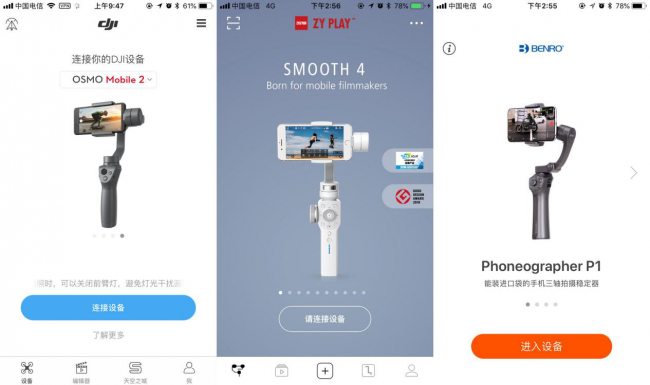 大疆作为世界知名大厂,在osmo1代被广泛吐槽app使用体验后,确实下了功夫升级软件使用细节,不过美中不足的是安卓端仍有些功能尚不支持,比如慢动作,而且从APP界面切出去,再切回来时,有时会需要重新连接,除此之外,DJI GO大多数时候的表现都很顺滑,APP自带的编辑器和“天空之城”视频社区也非常实用。智云的ZY Play则要逊色不少,除了上文提到的拍摄全景照片时经常莫名卡顿之外,安卓端app的使用体验实在是难以恭维,之前测试中曾尝试使用小米5,结果发现根本无法连接上APP,然而在说明书中支持机型里,明确写了支持小米5,测评君上网一查,发现智云的安卓版本app槽点满满,大部分安卓用户均表示使用过程中曾出现问题,所以如果你是非苹果用户的话,建议谨慎购买。百诺的APP BENRO在大多数情况下表现的都还算稳定,菜单图形化也是三款APP中做的最好的,不过UI仍有提升空间。