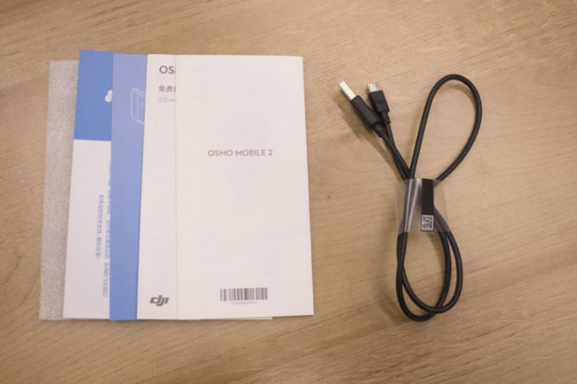 相比之下,大疆osmo mobile 2的配件就比较简陋了,除了一根充电线,就是说明书以及保修卡,再无其他。