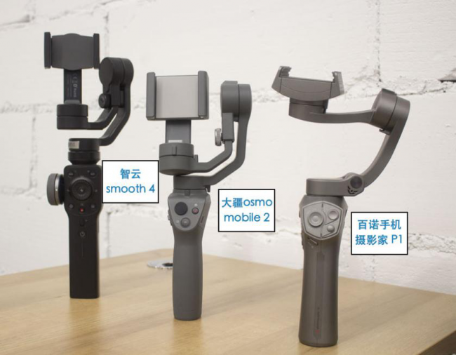 市场售价方面,大疆osmo mobile 2目前只有灰色这一款,官方售价899元,智云smooth4有黑色和白色两款,黑色售价699元,白色要比黑色贵100元,也就是799元,百诺手机摄影家 P1则是有碳灰、军绿、和玫瑰金三款,且售价都是799元。