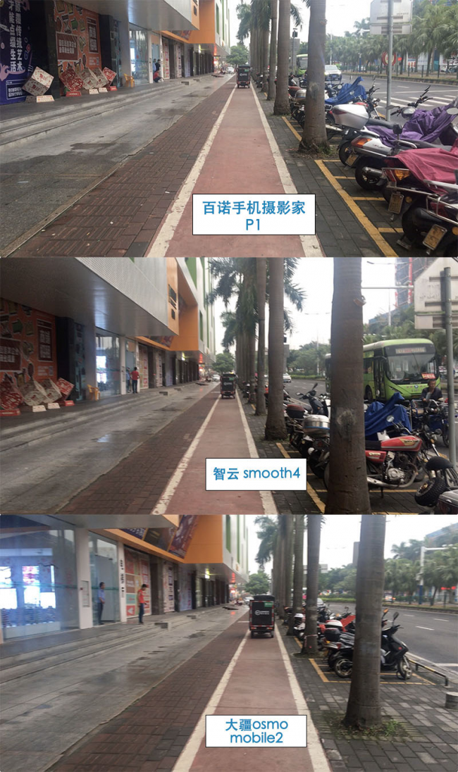 接下来是实拍测试,在户外同一路段,统一用1080p分辨率,采用相似的步伐速度进行了拍摄。对比发现并无太大异处。由此可见,在常规拍摄稳定性方面,三款产品是同一水平的,至少是没有明显的差距。