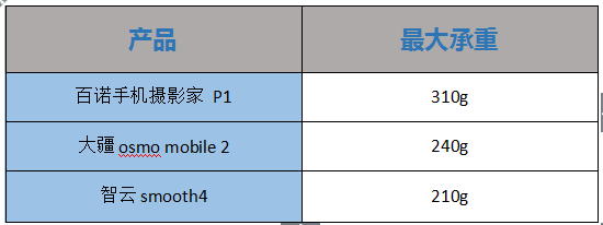 可以看到,重量基本和外观大小保持了一致,由轻到重依次是:百诺手机摄影家 P1、大疆osmo mobile 2、智云smooth4。承重是手持稳定器的重要参数之一,通常来说,手持稳定器的重量和其承重是有关的。这里分别将三款产品官网的数据进行了一个对比:
