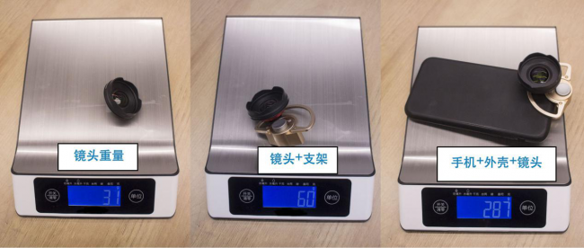 测评君找了个广角镜头进行称重,可以看到,外接镜头的重量是31g,加上支架,是60g,所以,如果需要使用iPhone xr(带壳)+外接镜头的话,总重量就是:287g。