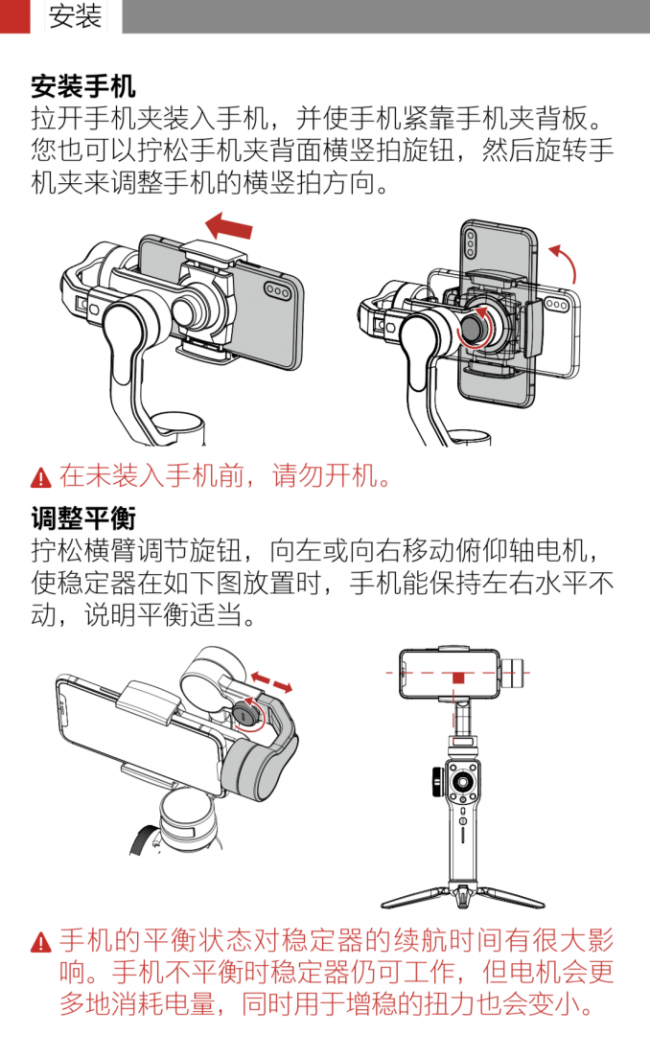 一方面,手持稳定器的安装都分为“安装固定”和“调节平衡”两个步骤。“调节平衡”一方面是为了更好的拍摄效果,另一方面,手持稳定器不平衡时电机会消耗更大的电量,同时用于增稳的扭力也会变小。
