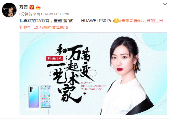 原来是被她亲切地称为“宝藏蓝孩”的华为P30 Pro,她还激动地亲自出境录制了开箱视频,并且发了微博,隔着屏幕都能感受出她的喜悦之情。时尚潮酷的万老板什么“大风大浪”没见过,怎么就偏偏喜欢上了TA?
