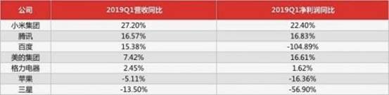 2019年一季度,在其他巨头纷纷受到不同因素影响,业绩开始下滑。而小米的营收和净利润依然保持了20%以上的增长,实属不易。