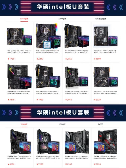 此外,华硕主板还为大家准备了多款人气B360主板、Z390主板和ROG精选的板U套装。其中特别推荐京东主板品类销量冠军——华硕TUF B360M-PLUS GAMING S电竞主板搭配Intel i5-9400F处理器的板U套装。该主板拥有超高性价比,曾斩获权威媒体快科技编辑选择奖和泡泡网年度性价比主板称号。拥有强化型7相数字供电,电力强劲且纯净,可完全释放酷睿i5-9400F台式机处理器的强劲性能。同时,该主板特别采用TUF军规认证用料,电竞特工I/O装甲,及包括SafeSlot高强度显卡插槽、ESD防静电保护和TUF LANGuard网络全防护等TUF GAMING电竞守护功能,可保障玩家长时间稳定运行。板载疾速3个M.2接口,其中一个为M.2(Key E)接口,可支持Type2230型Wi-Fi/蓝牙类型设备,如英特尔CNVi(Integrated Wi-Fi/蓝牙)模块,提供更顺畅的无线网络连接。强烈推荐追求高品质和性价比的游戏玩家入手,套包价仅售1759元,比单独购买实惠很多。