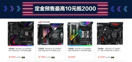 此次活动最大优惠之一就是定金预售,最高10元抵2000。共有5款超人气旗舰主板参与其中,包括Z390芯片组的ROG MAXIMUS XI EXTREME(后简写M11E)主板和ROG MAXIMUS XI FORMULA(后简写M11F)主板,X299芯片组的ROG RAMPAGE VI EXTREME(后简写R6E)主板和ROG RAMPAGE VI EXTREME OMEGA(后简写R6E OMEGA)主板,以及AMD X470平台的ROG CROSSHAIR VII HERO (WI-FI) (后简写C8H(WIFI))主板。