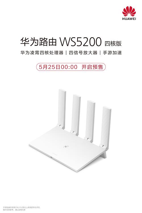 2019年5月25日,华为正式发布旗下首款四核路由器——华为路由WS5200四核版。这款路由器延续了华为路由WS5200系列经典的外观设计,并在硬件、软件层面对路由器进行了重大升级——搭载华为自研凌霄四核处理器+凌霄双频Wi-Fi芯片,配备四颗信号放大器,支持华为手机手游加速和HUAWEIHiLink IoT专属通道,售价249元。