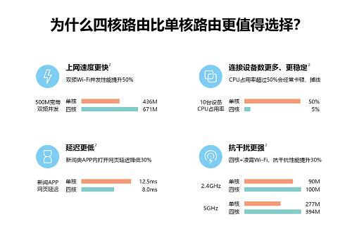 基于此,华为自主研发了家用路由器芯片——凌霄系列。此次搭载的凌霄四核处理器拥有高达5Gbps的数据转发能力,相比传统单核路由器,四核路由器具备速度快、连接稳、延迟低、抗干扰四大特性,给消费者带来更加畅快的上网体验。