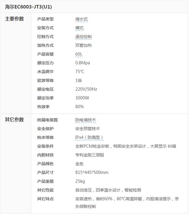 笔者从京东热水器页面找到不少新品,其中“京品家电”重点推荐了海尔60升智能速热型防电墙热水器EC6003-JT3(U1),具备“热水五倍智能增容”功能一键可将60升容量智能升级到300升,采用双3000双体分层加热速度更快,此外还加入了海尔最新研发的第三代专利防电墙2.0,支持远程APP操控,几乎满足了消费者在使用传统热水器时经常遇到的诸如水量不足需要排队洗澡、加热速度太慢、安全系数低、耗电量太大等困扰。