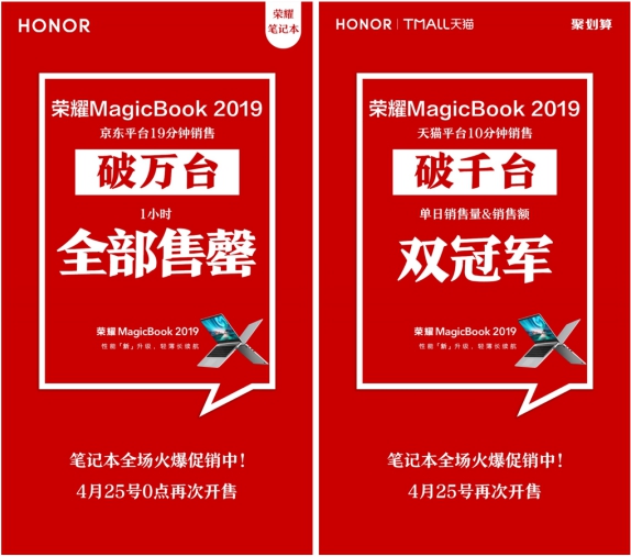 整体而言,荣耀MagicBook 2019锐龙版不论是外观、性能还是价格,在目前的笔记本市场都极具竞争力。这也就不难理解,为何在首销期间这款新品就取得京东平台19分钟销售破万台、1小时全部售罄,天猫平台10分钟销量破千台的惊人战绩,并最终斩获双平台、销量销售额双冠军。