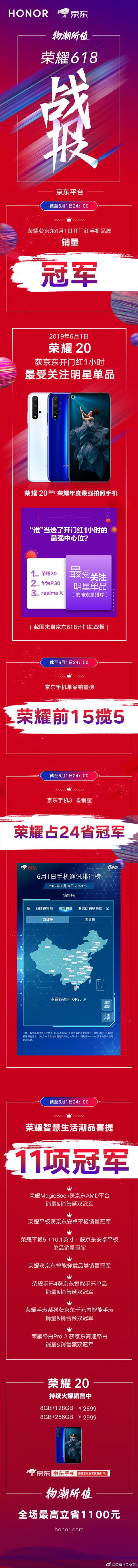 京东平台:荣耀斩获京东6月1日开门红手机品牌销量冠军;荣耀20成为京东开门红1小时最受关注明星单品;京东手机单品销量,荣耀前15揽5;京东手机31省销量,荣耀占24省冠军。
