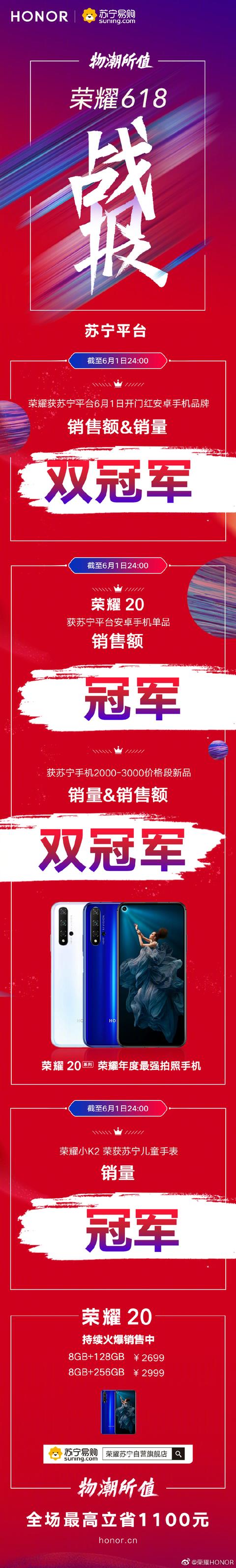 苏宁平台:荣耀获苏宁平台6月1日开门红安卓手机品牌销售额&销量双冠军;荣耀20获苏宁平台安卓手机单品销售额冠军以及2000-3000价位段新品销售额&销量双冠军。