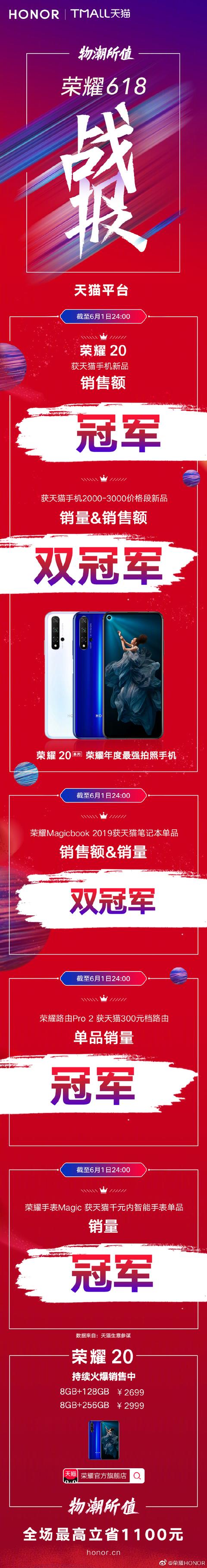 天猫平台:荣耀20获天猫手机新品销售额冠军以及天猫手机2000-3000价格段新品销量&销售额双冠军。