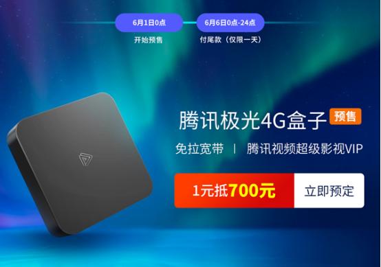 6月,当全网陷入618年中大庆购物狂欢节,而作为国内OTT盒子领域领先品牌的腾讯极光4G盒子,则开启了一场别开生面的618活动。从6月1日00:00至6月5日23:59之前,超值优惠券大派送。现在起,支付定金1元,到6日支付尾款,最高可抵700元,限量优惠限时领取,错过就要等明年了。