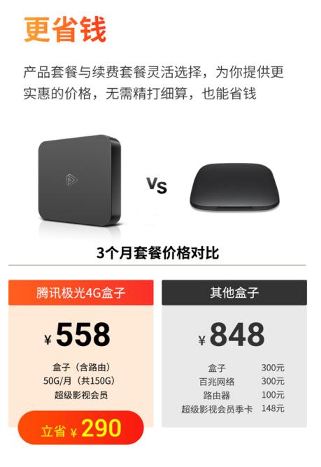 帮你把装宽带、买腾讯超级影视会员、买无线路由器的钱都省下来了,跟其他盒子对比每年可以至少节省690块的支出。如果选择套餐续费,多种套餐给你选择,非常灵活,无需精打细算就能帮你省钱,而套餐续费每月低至25元。