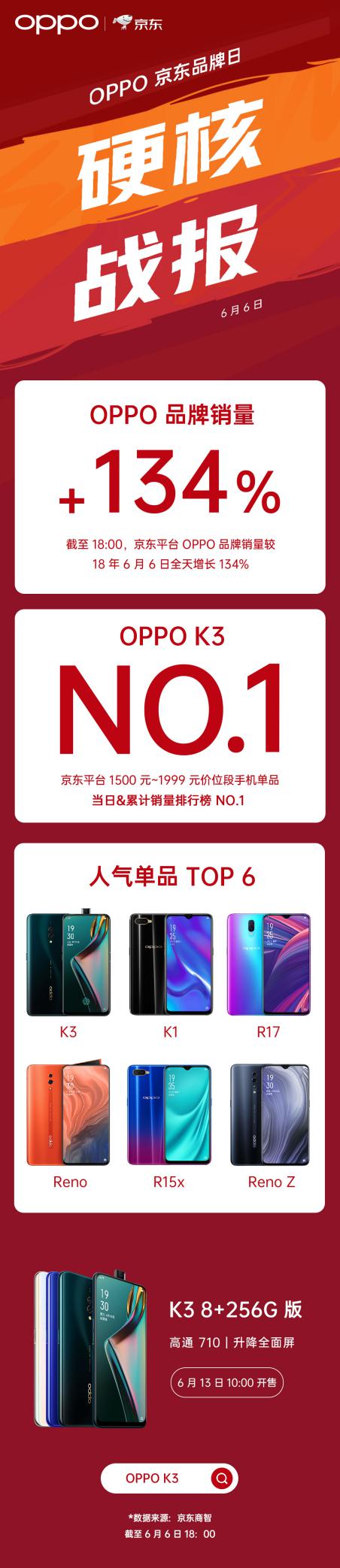 自5月23日OPPO K3正式发布以来,产品关注度持续走高,首先发布会当天在京东和天猫商城的抢先购就吸引了不少消费者。抢先购活动两小时后,更是分别夺得天猫平台全价位段和京东平台1000~2000元价位段两项销量冠军,伴随着6月1日OPPO K3官方的正式销售,OPPO K3的热度更是不断攀升。