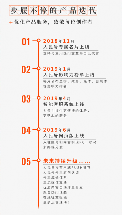 随着平台汇聚越来越多的创作者与读者,“人民号”也一直紧盯最新移动互联网技术成果,不断创新平台方式和内容呈现形式,推进与人民日报客户端的深度融合。成立一年以来,“人民号”陆续上线了专属名片、影响力榜单、智能客服系统、人民号网页版等产品服务,未来还将持续升级客户端Push推荐、号主原创认证、主流媒体算法等产品功能,旨在通过技术赋能更好地实现“做优内容,做精产品,聚拢用户,做大平台”的目标,壮大主流媒体的声音。