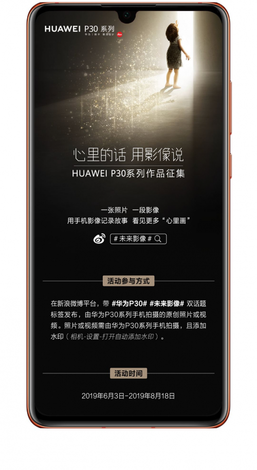 同时为了开拓影像的更大价值与意义,华为P30系列最近在新浪微博平台发起了“心里的话,用影像说”征集活动,即日起至2019年8月18日,用户带#华为P30##未来影像#双话题标签,发布由华为P30系列手机拍摄的原创照片和视频,添加水印,即可参与到华为P30系列作品征集活动中,赶紧行动起来吧!