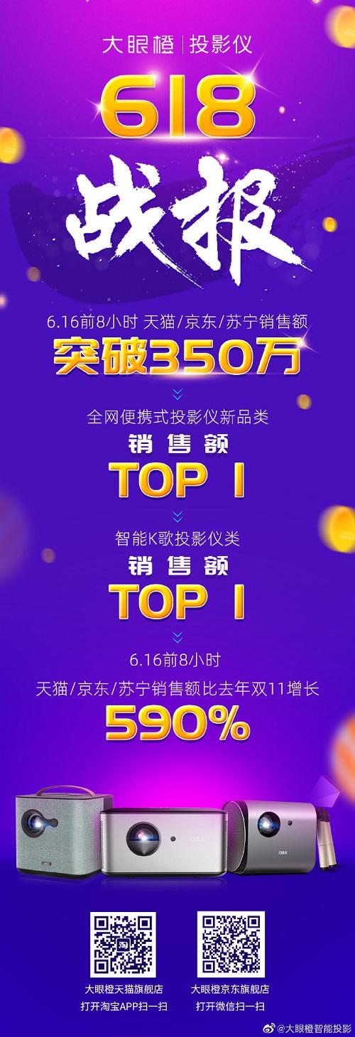 在影像品类中 ,智能家用投影仪成交额是去年同期的4到5倍,国产投影仪品牌极米、坚果、大眼橙依旧是品牌主力,从数据上看智能投影行业销售增幅明显。其中,阿雅代言的大眼橙作为后起新秀,活动零点开始就在天猫、京东、苏宁三大电商品台销售额突破了350万 ,其产品大眼橙x9一举成为 K歌投影仪品类的销售冠军 ,实力不容小觑。