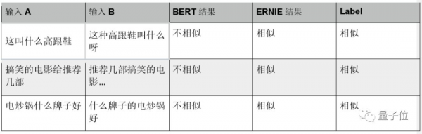 ERNIE在训练中引入的DLM能有效地提升模型对文本相似度的建模能力。因此,我们比较文本相似度任务LCQMC数据集上二者的表现。从下表的预测结果可以看出,ERNIE学习到了中文复杂的语序变化。最终ERNIE与BERT在该任务数据的预测准确率为87.4%、87.0%.