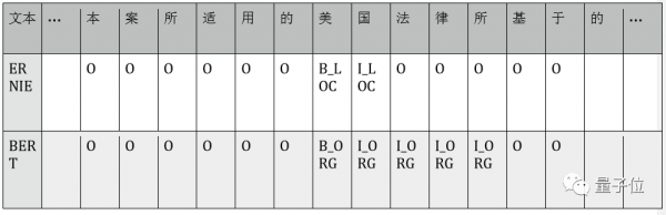 Case对比:摘自MSRA-NER数据测试集中的三段句子。B_LOC/I_LOC为地点实体的标签,B_ORG/L_ORG为机构实体的标签,O为无实体类别标签。下表分别展现了 ERNIE、BERT模型在每个字上的标注结果。