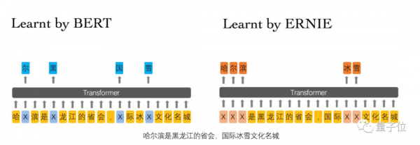 简单来说,百度ERNIE采用的Masked Language Model是一种带有先验知识Mask机制。可以在下图中看到,如果采用BERT随机mask,则根据后缀“龙江”即可轻易预测出“黑”字。引入了词、实体mask之后,“黑龙江”作为一个整体被mask掉了,因此模型不得不从更长距离的依赖(“冰雪文化名城”)中学习相关性。
