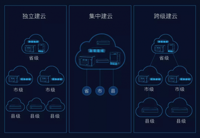 集中建云,上下级集中组建云,共用一个资源池,负载均衡,提升资源利用率,对出口带宽要求较高,适合部署在大型数据中心。
