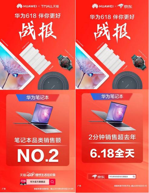 据战报显示,6月18日00:00后仅5分钟,华为天猫官方旗舰店融合品类销售额就超过了去年618全天,华为笔记本销售额更是仅用2分钟就超去年618全天!凭借其硬核实力,华为笔记本品类销售额跃居全品牌笔记本品类销售排行榜第2位!