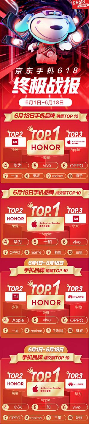 一年一度的618大战终于落下帷幕。6月19日,京东手机通讯官方发布618最终战报。荣耀获得6.1-6.18京东平台手机品牌销量和安卓手机累计成交额双冠军;同时拿下6月18日当日手机品牌销量&安卓手机成交额双冠军。在6.1-6.18日京东手机单品销量TOP10中,荣耀六款产品进入榜单并包揽前三名。